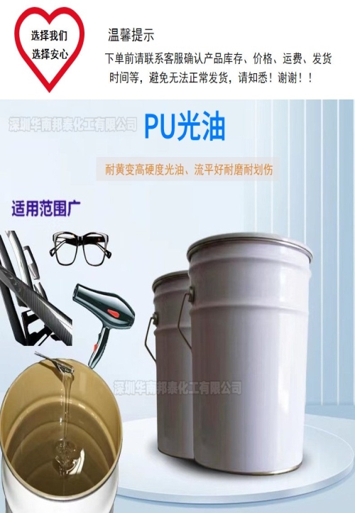 )!包装规格:5kg/桶、20kg/桶(主剂+固化剂+稀释剂配套分开包装)-储存时应密封避光,产品的保质期一般为12个月.PU光油凭借其高光泽、强耐磨和环保特性,成为表面涂装的方案。适用于家居、工业、工艺品等多领域,既能提升产品颜值,又能延长使用寿命!选购时请根据基材类型和施工条件选择适配型号,并严格遵循操作规范以达到佳效果.如需定制配方或技术指导,请联系我们的专业团队.调色订制产品的加工时间保障,一般情况下2-3天以內是正常,急件联系客服,安排时间,具体以客服按照接单量提供准确的交货期为准,时间计算:接单付款当天不算,次日开始计算。